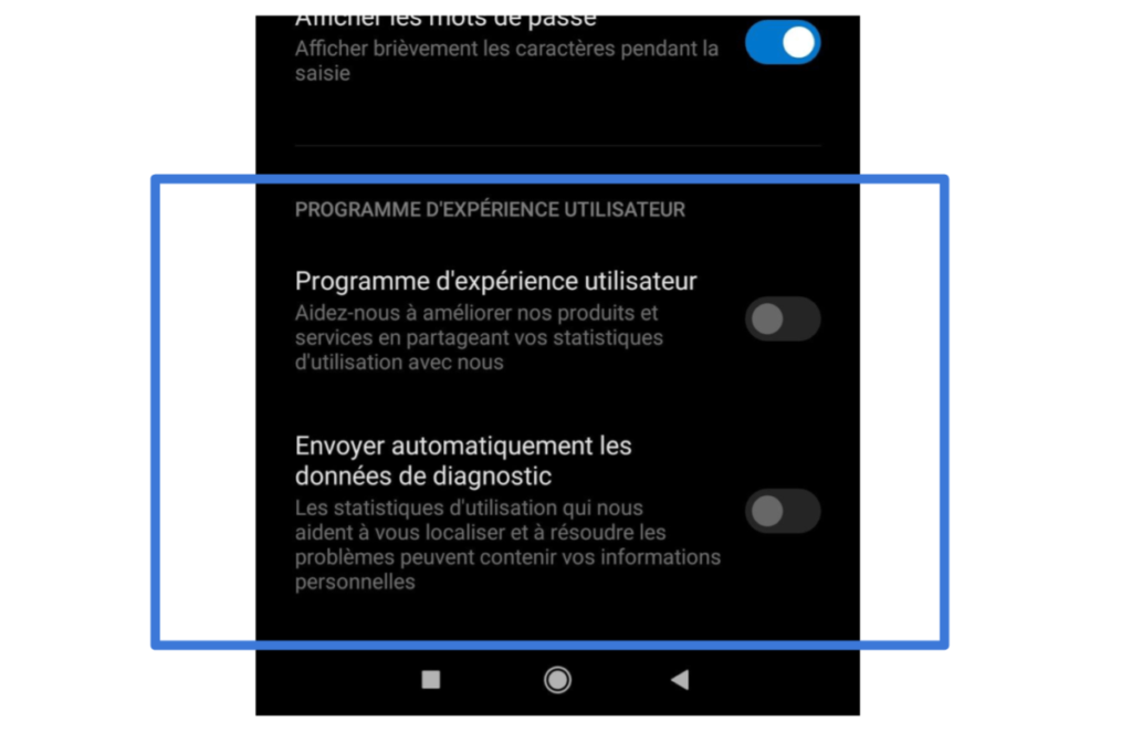 Il faut aller dans Paramètres > Mots de passe et sécurité > Paramètres de confidentialité > Programme d’expérience utilisateur