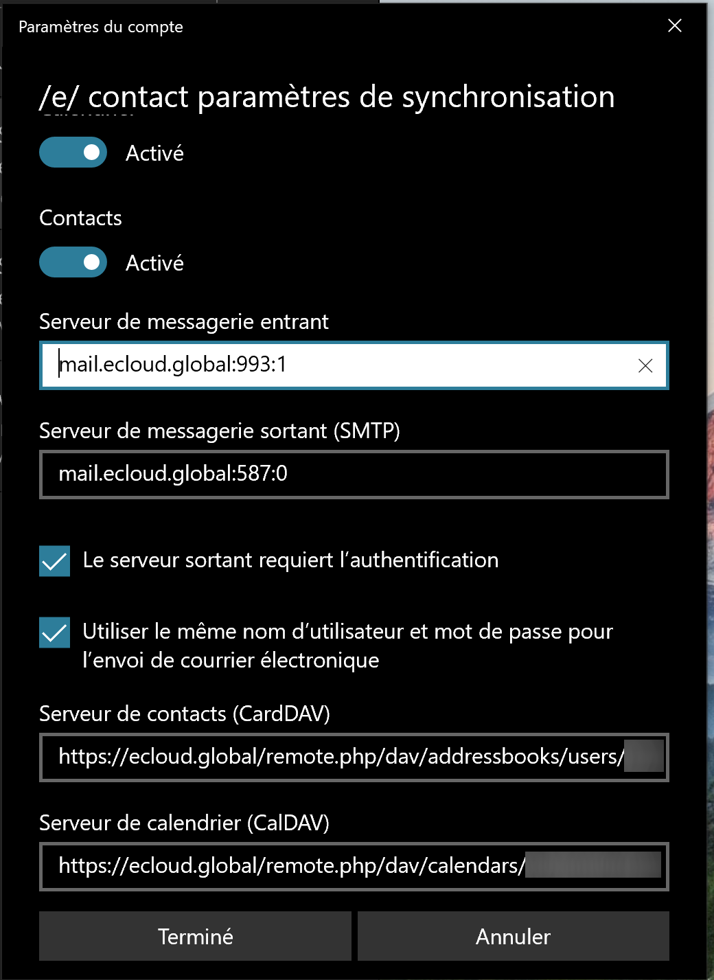 - Dans serveur entrant entrer : mail.ecloud.global:993:1