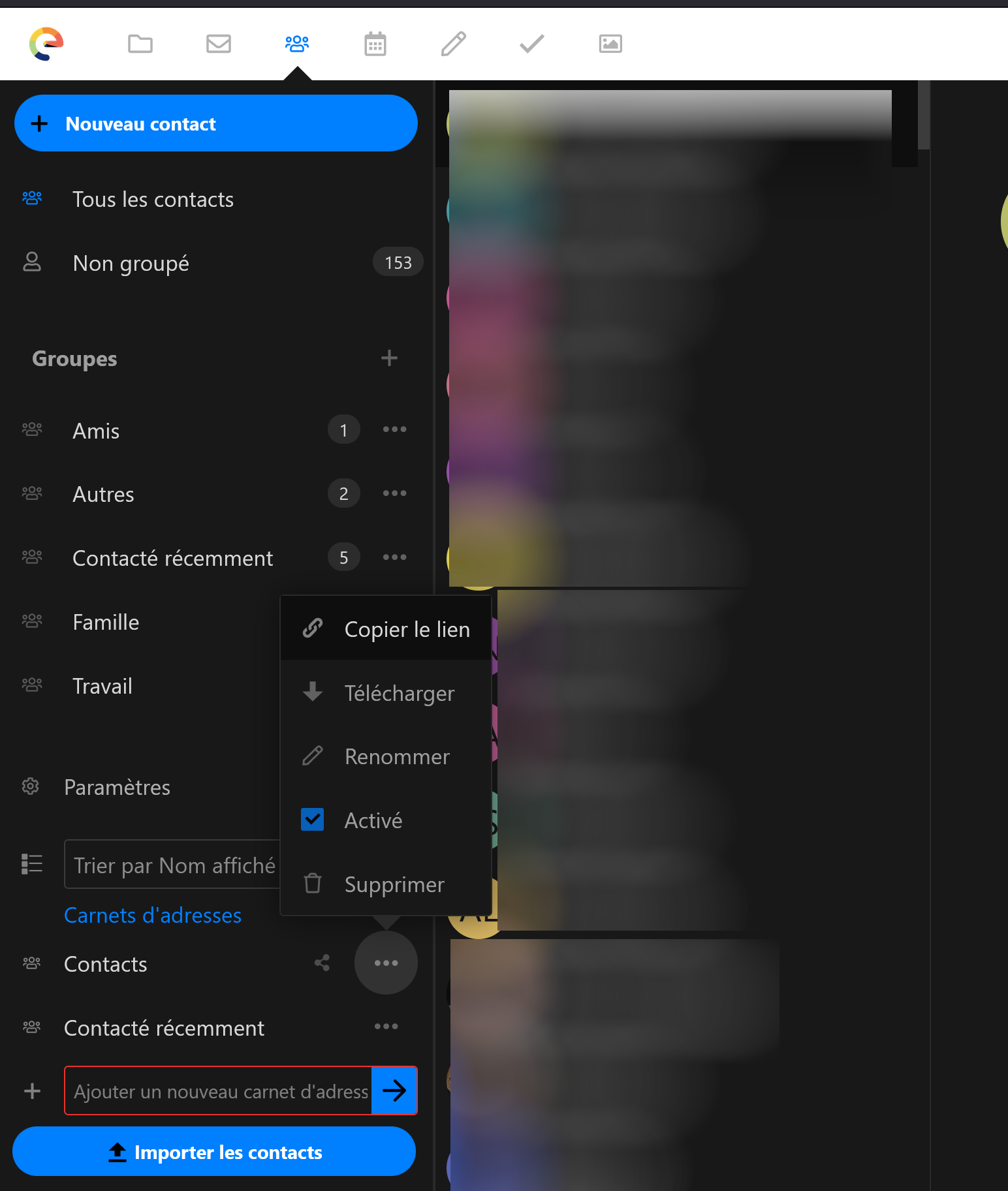 Pour récupérer le lien de vos contact, aller dans votre espace /e/ sur votre navigateur => contact => paramètres (en bas) => cliquer sur les 3 points de contacts => copier le lien