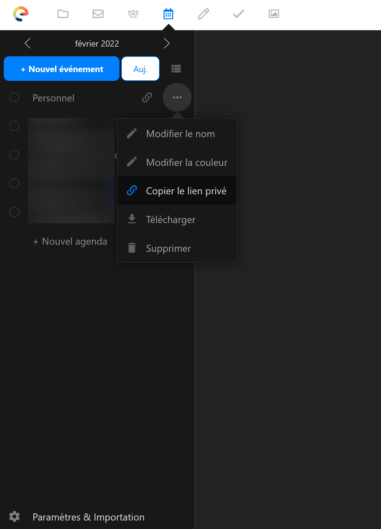 Pour récupérer le lien de vos contact, aller dans votre espace /e/ sur votre navigateur => calendrier => cliquer sur les 3 points de personnel => copier le lien privée