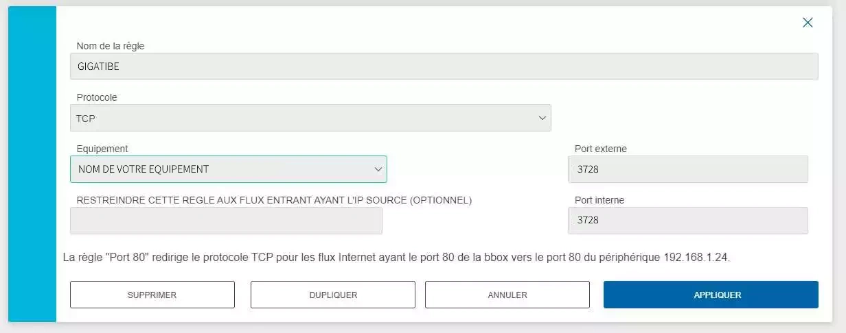 - Équipement : IP de destination ou nom de l’ordinateur : l’adresse IP de type 192.168.1.xxx du PC sur lequel le gigatribe est installer (si cous ne savez pas aller dans gigatribe=>outils=>option=>réseaux=>adresse ip local ) ou Sélectionnez le nom de votre ordinateur dans la liste déroulante
