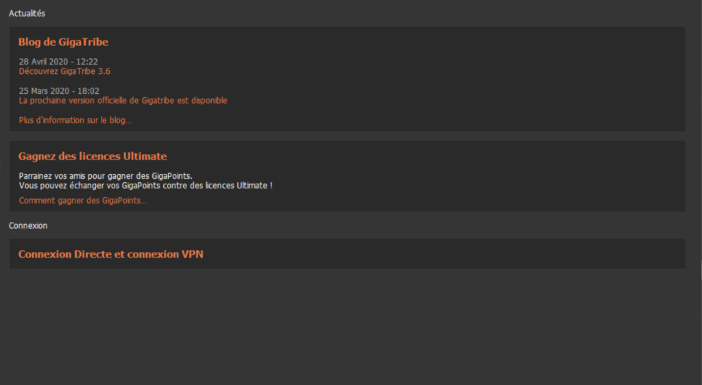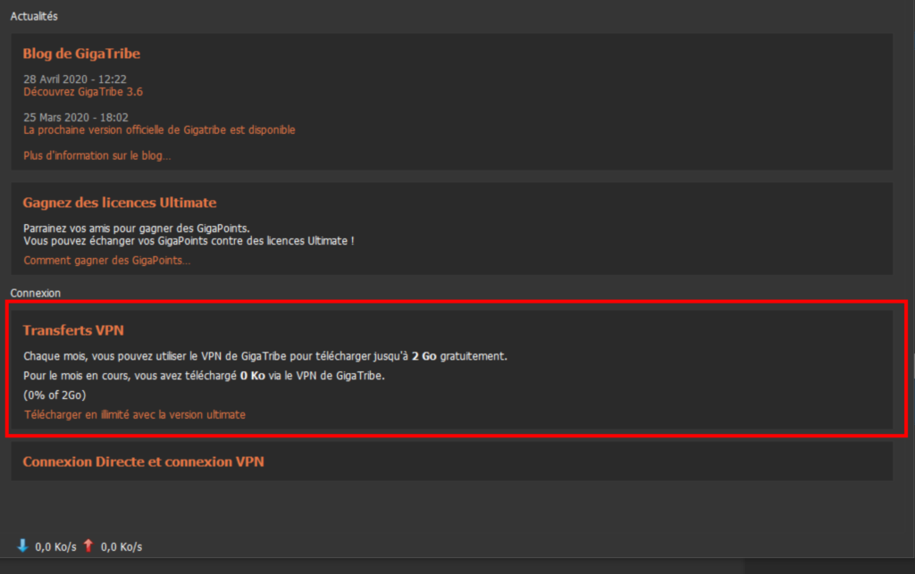 - En mode VPN un article s’ajoute “Transferts VPN” avec le quota de téléchargement pour les licences gratuite ou VPN.