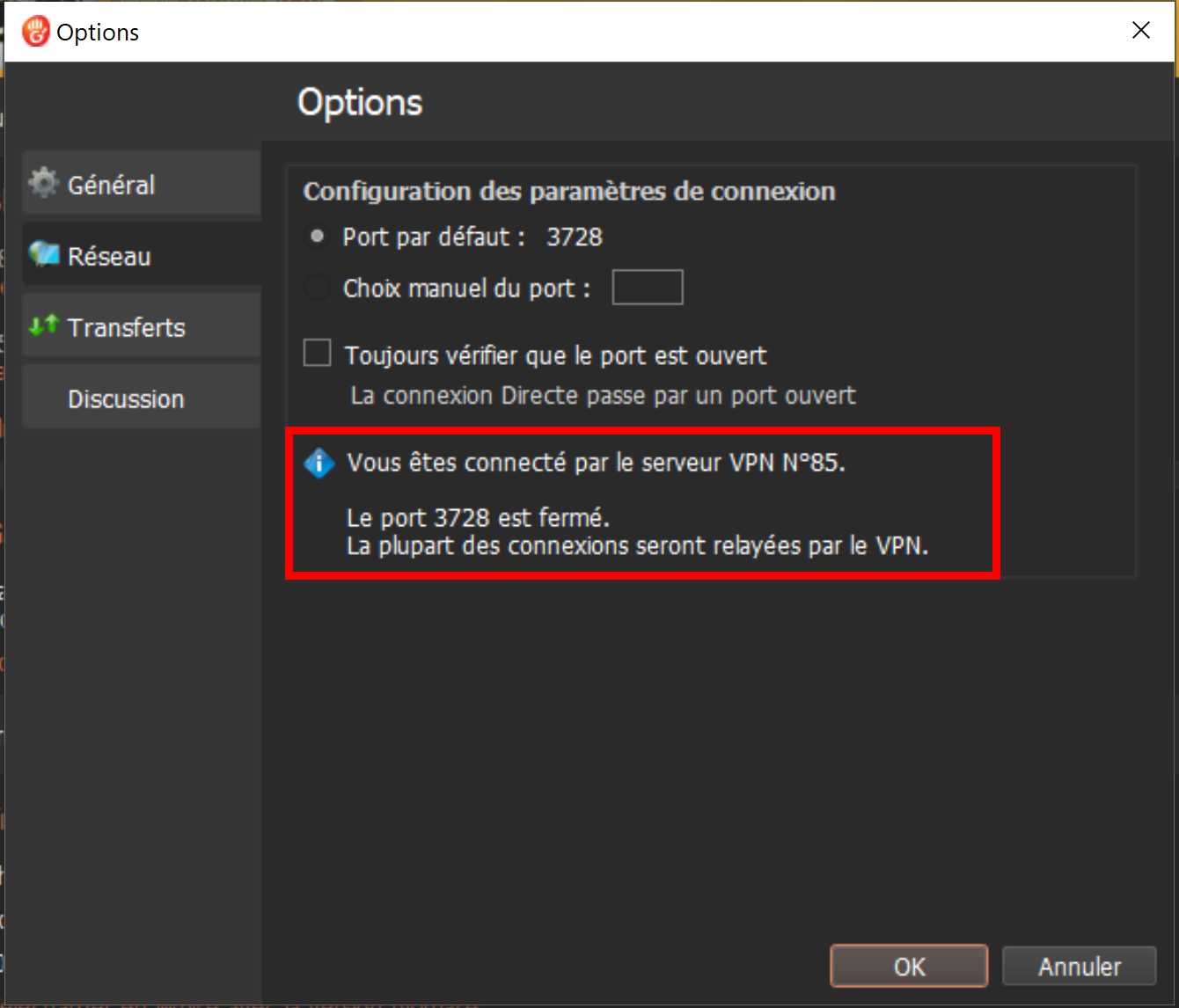 Noter, si vous souhaitez être connecté seulement en mode direct, vous pouvez cocher la case “Toujours vérifier que le port est ouvert”