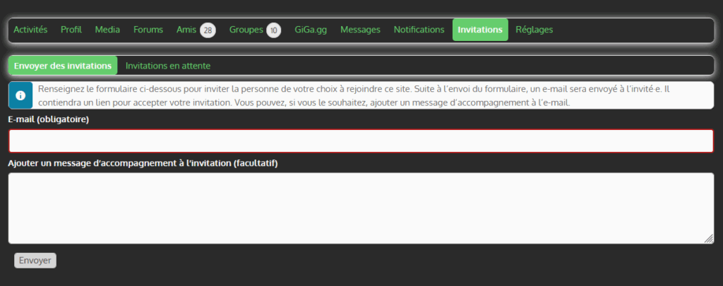 Chaque utilisateur inscrit pourra inviter un amis sur le site via la page invitation de leur profil.