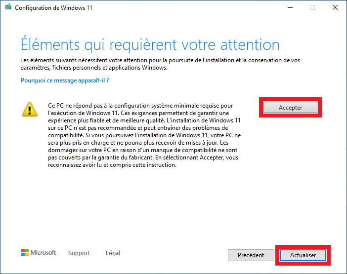 Il ne vous reste plus qu’à cliquer sur “Accepter” puis sur “Actualiser” pour démarrer enfin, l’installation de Windows 11 !
