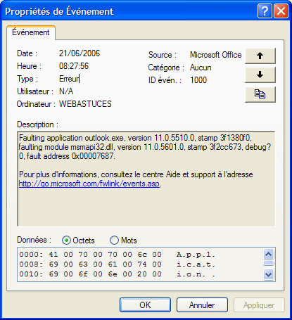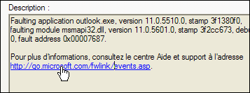 - La zone de texte Description vous donne une petite explication de l’événement qui s’est produit. C’est une information importante puisqu’elle vous permet généralement de savoir ce qui s’est passé. Dans notre exemple,le problème provient d’Outlook.