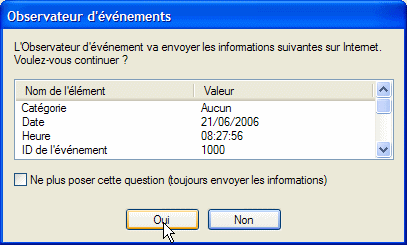 - Après avoir cliqué sur le lien, une boîte de dialogue apparaît. Cliquez sur le bouton Oui afin d’autoriser le programme à envoyer des d’informations relatives à l’événement à Microsoft.