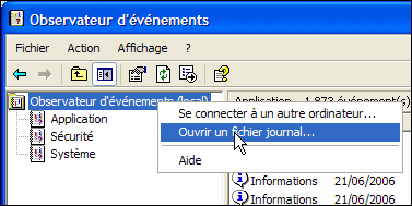 - Cliquez avec le bouton droit de la souris sur l’élément Observateur d’événements (local) puis cliquez sur Ouvrir un fichier journal.