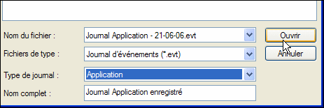 - Sélectionnez alors le fichier journal à ouvrir, sélectionnez son type dans la liste Type de journal : Application, Sécurité, ou bien Système, puis cliquez sur le bouton Ouvrir.