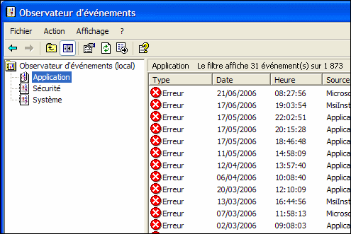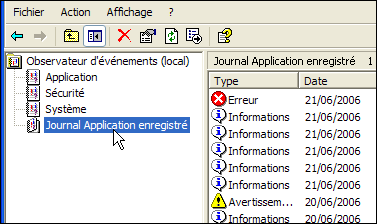 - Dans le cadre gauche de la fenêtre, cliquez sur le journal que vous souhaitez afficher, Application par exemple. Les événements contenus dans ce journal s’affichent alors dans la partie droite de la fenêtre.