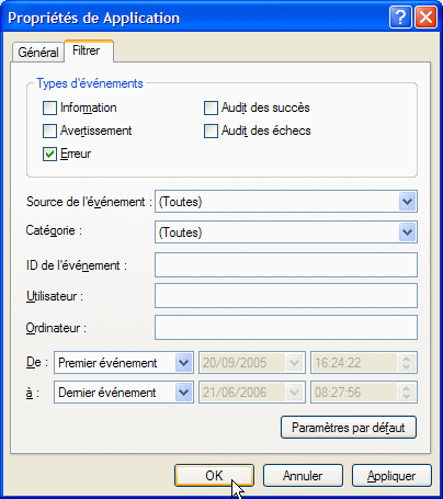 - Par la suite, pour désactiver le filtrage, retournez dans l’onglet Filtre des Propriétés du journal puis cliquez sur le bouton Paramètres par défaut. Validez par OK