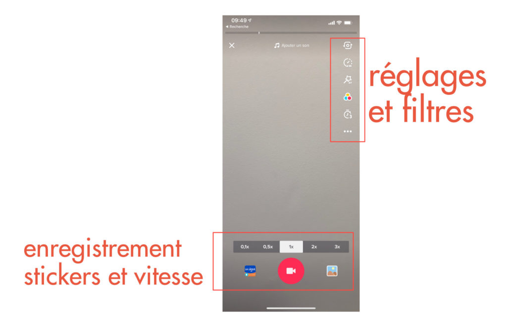 Le bouton « Ajouter un son » permet d’ajouter une musique en fond de vidéo. Il faut cliquer dessus avant de commencer à filmer : apprenez à le maîtriser, c’est tout l’intérêt de TikTok !