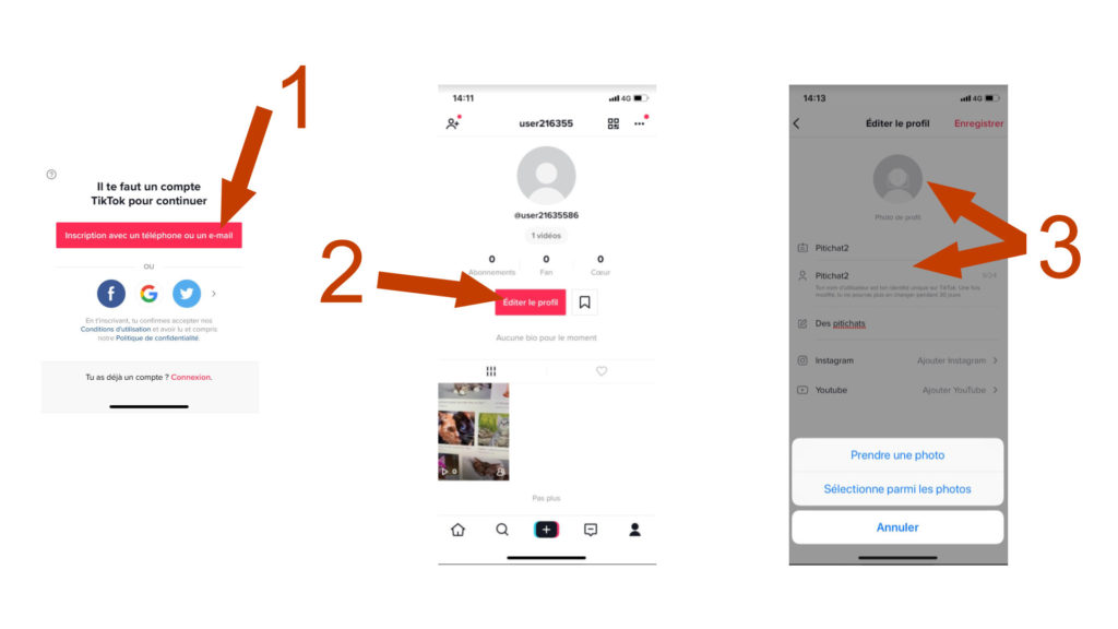 Une fois que ceci est fait, vous allez être redirigé sur la page d’accueil. Cliquez alors de nouveau sur la silhouette en bas à droite. Vous obtenez un aperçu de votre profil. Pour le modifier, cliquez sur le bouton « éditer le profil » (2). Vous pouvez modifier directement votre pseudonyme et votre nom d’utilisateur (3). Les deux s’afficheront sur votre profil. Attention à votre choix de nom d’utilisateur : une fois qu’il est enregistré, il faut attendre 30 jours pour pouvoir le modifier de nouveau.