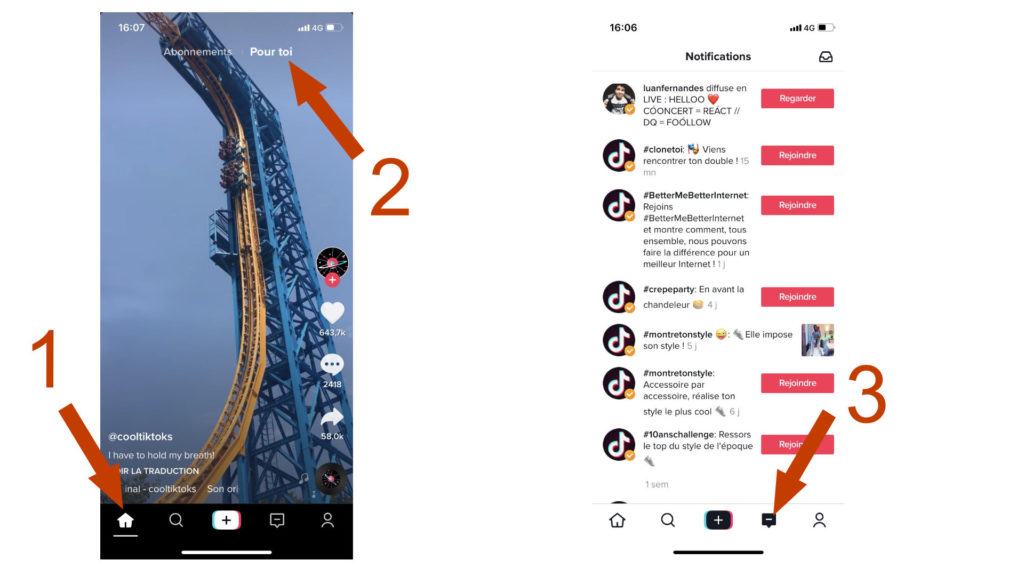 Le plus simple pour commencer, c’est de vous imprégner un peu de l’esprit TikTok en regardant des vidéos. Cliquez en bas de l’écran sur la petite icône en forme de loupe (en 1).