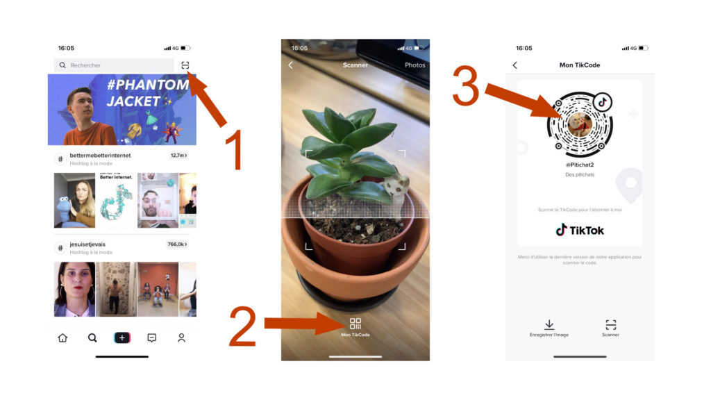 Il est également possible de scanner le QR code de l’ami en question. Dans l’onglet loupe, cliquez sur l’icône située à droite de l’espace « rechercher » (en 1). À la place de la jolie plante que vous voyez ci-dessous, placez le QR code de votre ami. Cela vous renverra vers son profil. Pour trouver votre code ou le sien, il suffit de cliquer sur « Mon TikCode » (en 2).