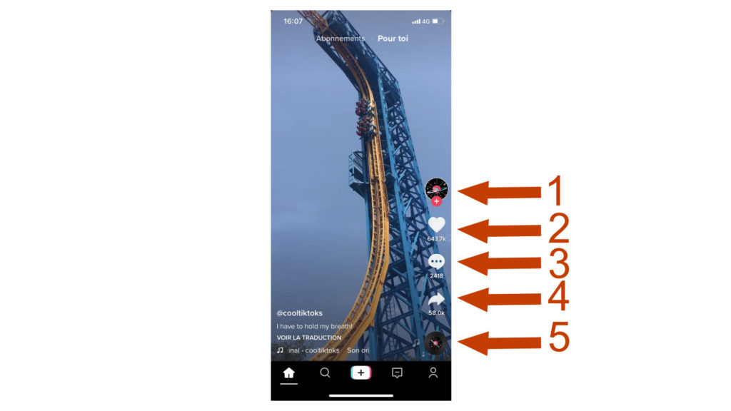 Une fois que vous avez compris comment regarder du contenu, vous pouvez commencer à interagir avec celles et ceux qui le postent. Le bouton 1 renvoie au profil de la personne qui a publié la vidéo (et vous permet de la suivre ensuite si vous le souhaitez). Le 2 permet de liker la vidéo, le 3 de la commenter (tout le monde peut voir votre commentaire), le 4 de la partager (pour l’envoyer en message privé à un ami, ou sur un autre réseau social) ou la mettre en favori. Ce bouton permet aussi de répondre en vidéo (voir le point suivant). Le bouton 5 renvoie à toutes les vidéos contenant les musiques utilisées.